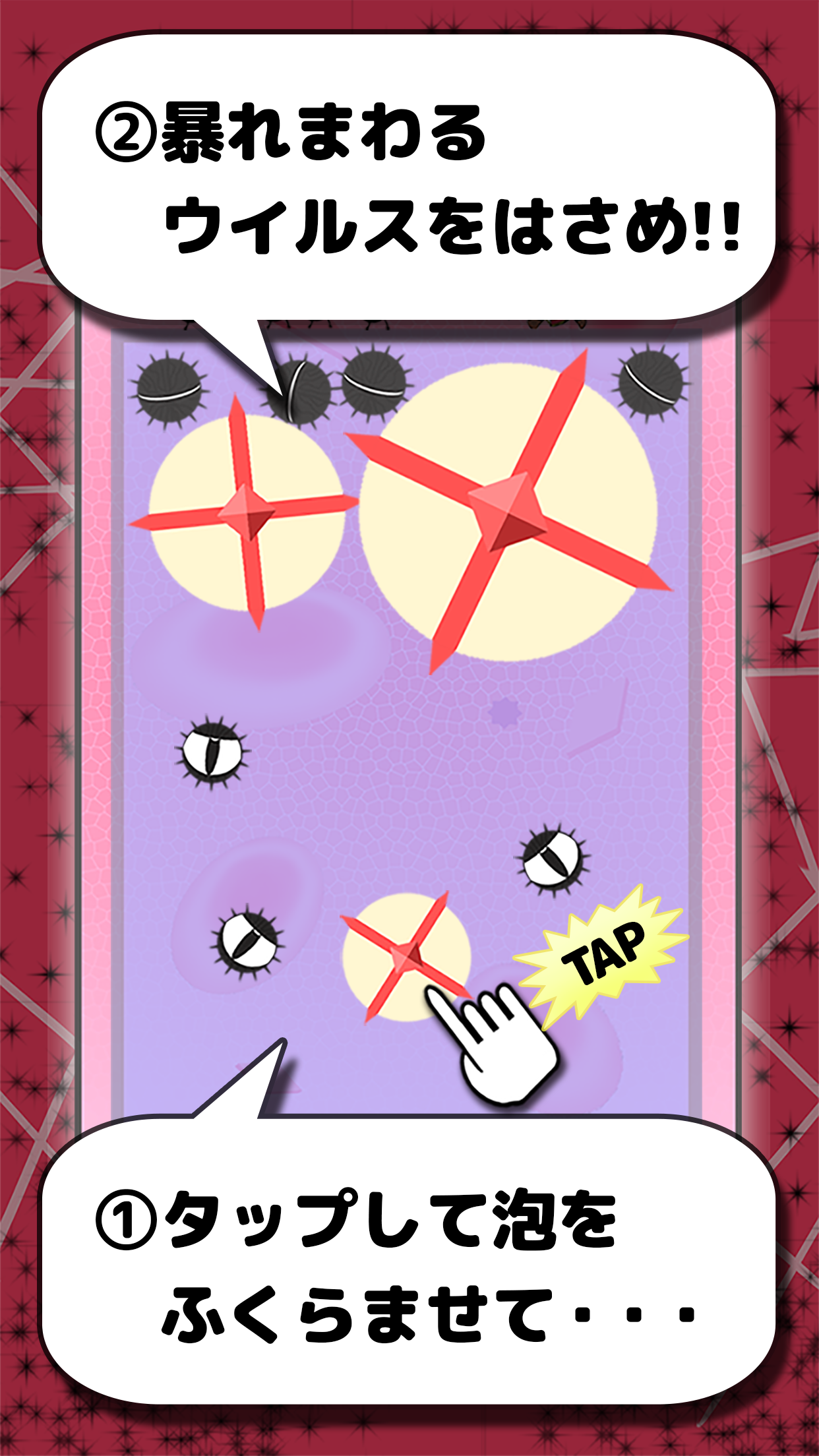 ルールはとってもカンタン。画面をタップして白血球を膨らませ、ウイルスを挟んで動きを止めよう。