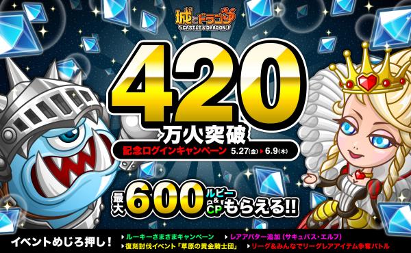 5月27日(金)メンテナンス後より、『城とドラゴン』の登録ユーザー数が420万人を突破したことを記念して、