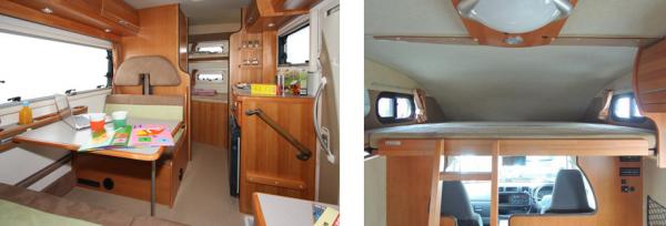 リアはダブルタイヤで安定した走行ができ、キャンピングカーレンタルが初めての方でもラクラク運転できます!無垢の木材をふんだんに使用した、明るくおしゃれなインテリアには最大5人までの就寝が可能。