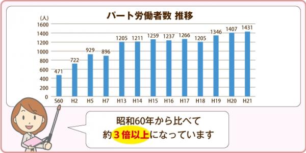 パートとしての雇用形態が主婦にあっている、またはその働き方になってしまう現状が考えられます。