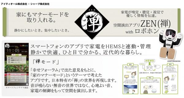 「家のマナーモード 禅アプリ」は、HEMSアライアンスの「幸せフォーラム」活動から出たアイデア「家電のマナーモード」をもとに、HEMSアライアンス道場プロデューサであるKDDI株式会社、シャープ株式会社と共同で企画し、アイティオール株式会社が開発しました。