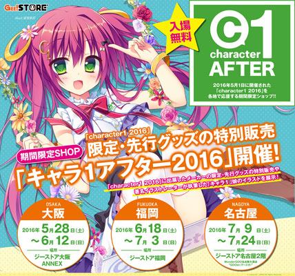 5月1日(日)に東京ビックサイトにて開催された「character1 2016」を 各地で応援する入場無料イベント『キャラ1アフター2016』の開催が決定。 5月28日(土)からのジーストア大阪ANNEXを皮切りに、福岡・名古屋のジーストア各店舗を順次巡回してまいります。
