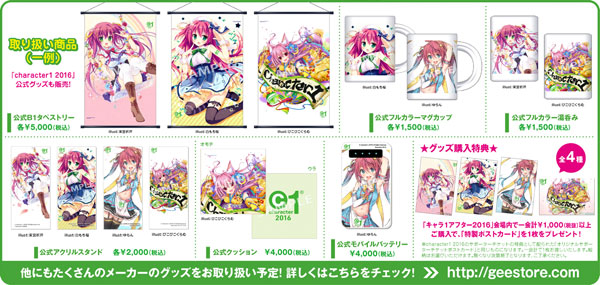 イラストレーター"茉宮祈芹 先生、白もち桜 先生、ゆらん 先生、ぴこぴこぐらむ 先生"による「character1 2016公式グッズ」をはじめ、出展企業様のグッズを多数販売。残念ながら「character1 2016」の会場に来られなかった皆さんも、あの限定グッズを手に入れるチャンスです!!