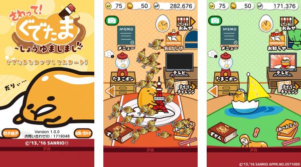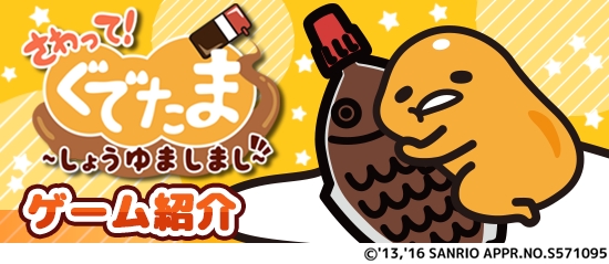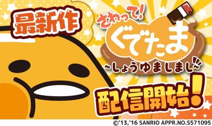 株式会社グッドラックスリー(本社:福岡県福岡市、代表取締役CEO:井上和久、以下「グッドラックスリー」)とギャザリング株式会社(本社:東京都千代田区、代表取締役社長:戸田和宏、以下「ギャザリング」)は、株式会社サンリオ(本社:東京都品川区、代表取締役社長:辻信太郎、以下「サンリオ」)よりライセンス許諾を受け、人気キャラクター「ぐでたま」が登場するゲームアプリ『さわって!ぐでたま ~しょうゆましまし~』(以下、本作)をGooglePlay/AppStoreにて、本日2016年6月3日(金)に配信を開始したことをお知らせいたします。