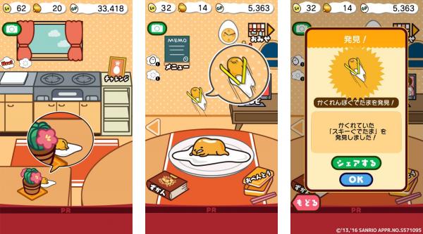 ときどき出現するおへやに隠れている「ぐでたま」や「ニセたまさん」たちを見つけたらつかまえてみよう!