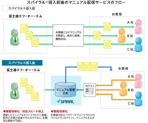 富士通エフ・オー・エムは、2016年2月に、Office 365アップデート等の最新情報を反映した各種マニュアルを定期的にクラウドで提供する新サービス「Office 365 マニュアル配信サービス」をリリースし、従来は顧客1社ごとにマニュアルを個別配布していた定着化ソリューションをクラウド化することで、顧客のOffice 365推進担当者の作業効率を大幅に向上しました。この「Office 365 マニュアル配信サービス」のデータ基盤及び配信基盤は「スパイラル(R)」で構築されています。