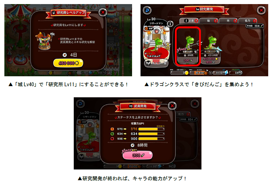 キャラの能力 (攻撃力・防御力・体力)をアップすることができます。なお、「きびだんご」で