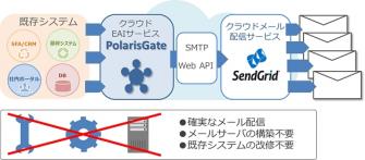 「SendGrid」は、SMTPやWeb API、マーケティングメール機能の3種類でメール送信が可能です。「PolarisGate」では、基幹システムやCRM等のデータベースの情報を「SendGrid」に簡易に連携してこれら3種類のメール配信をできるだけでなく、ExcelやWord等で帳票を作成し、それらをメールに添付して配信することも可能となります。