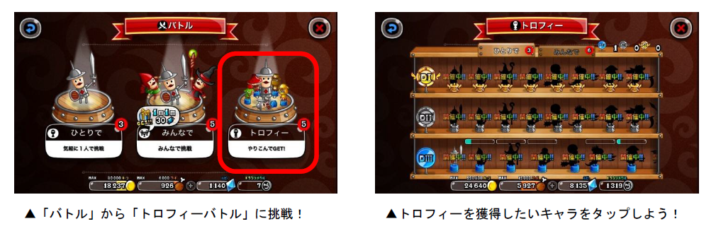 「トロフィーバトル」は、各キャラのトロフィー獲得を目指して、全国のプレイヤーとバトルを行ないます。