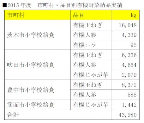 有機農産物とは、種まき・植え付け前の2 年以上及び栽培中に、原則として化学合成肥料や農薬を使用していない農産物のことで、収穫後も他の農産物と混ざらないように国の認証制度によって管理されています。有機農業は豊かな大地を守る為の土づくりから、収穫し子供たちが食べる学校給食になるまで、化学合成物質に汚染されず、環境に負担をかけないように管理されている生産システムです。2015 年度は、茨木・吹田・豊中・箕面の4 市で、合計43,980kg(対前年+5,230kg)の有機野菜を学校給食のメニューに取り入れていただくことができました。引き続き2016 年度も、より多くの子供たちに有機野菜をお届けし、実際に食べてもらうことで環境保全を応援し、豊かな未来を残す一員となっていただけるよう努めて参ります。