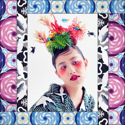 琉球王国がルーツの紅型(びんがた)をモチーフにしたオリジナル文様を中心に、今年生誕300年を迎えた伊藤若冲からインスパイアされたシリーズや、江戸時代の型紙をベースにアレンジしたものなどを、扇子型も含めた様々なスタイルで展示・販売いたします。また、西岡氏が私立恵比寿中学のビジュアル、衣装のために作った文様で仕立てた振り袖も初公開。さらに京都の老舗、宮脇賣扇庵製の扇子など、MADE IN KYOTOにこだわった様々なアイテムや本展限定の商品、オリジナル雑貨類も多数紹介・販売いたします。