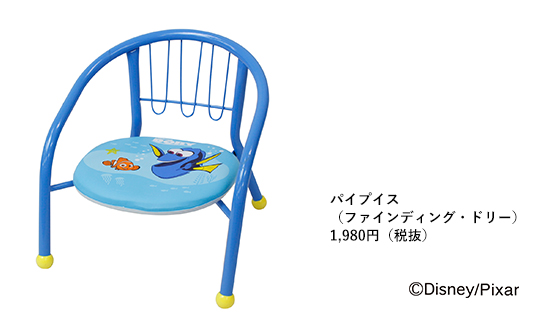 『ファインディング・ドリー』は大ヒット作『ファインディング・ニモ』の13年ぶりとなる続編で、「ニモ」の親友「ドリー」の冒険物語。パイプイスにも「ニモ」と「ドリー」が仲良く描かれ、座ると笛が鳴る楽しい商品です。