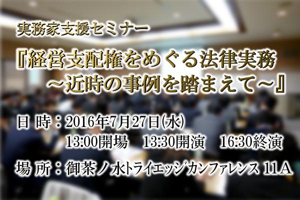 新日本法規出版株式会社(所在地:愛知県名古屋市中区栄1丁目23番20号、代表取締役:服部昭三 http://www.sn-hoki.co.jp/) は、企業法務に携わる法律実務家、法務担当者、経営者等を対象として、近年、急増している経営支配権をめぐる紛争について、直近の事例を紹介したうえで具体的にどのような攻防がなされるのかを事例に沿って解説する実務家支援セミナー『経営支配権をめぐる法律実務 ~近時の事例を踏まえて~』を2016年7月27日(水)に東京で開催します。