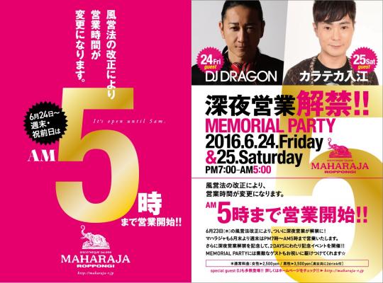 クラブの聖地、六本木界隈で30年以上の歴史を持つ『マハラジャ』(運営元:日本都市プロダクション株式会社)は、この風営法改正に伴い6月24日からAM5:00まで営業を開始いたします。