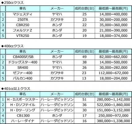 情報流通支援サービスの株式会社オークネット(本社:東京都港区/社長:藤崎清孝)は、 2016年5月度のオークネットバイクオークションにおける成約台数を集計し、排気量別ランキングベスト5をまとめました。