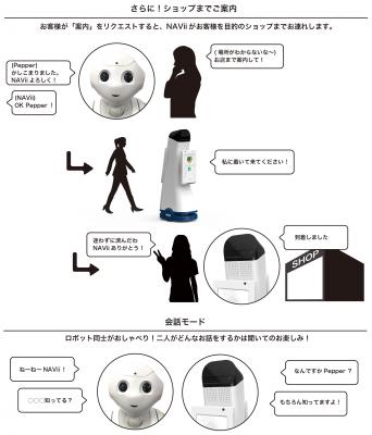 パルコは「独自の先行的ICT活用」を中期経営計画における事業戦略の柱として掲げ、消費環境の急速な変化に対応するべく、ICT を活用し店舗でのデジタル環境を整備することで新たな消費体験の提供を推進しております。パルコの最新施設である仙台パルコ2において、アメリカと日本の最新ロボットを同時に導入よることにより、お客様の“快適”で“楽しい”ショッピング体験の実現を目指してまいります。ナビーとPepperは、多言語でお客様と会話を行いながら、仙台パルコ2の出店ショップのデータベースから、お客様がお探しのショップや館内施設をご案内いたします。