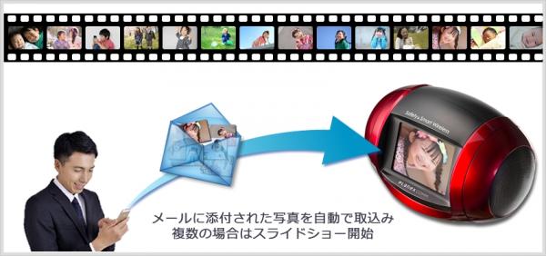 またメールから写真を自動で取込む新機能を追加しました。従来の『かんたんインターネットラジオ デジタルフォトフレーム』では、パソコンに接続しUSB経由で写真を送る必要があり、手順が煩雑なものでした。この新機能は、メールに写真を貼付して送るだけで、自動でフォトフレームに取り込みます。例えば、ご高齢の両親にプレゼントしたかんたんインターネットラジオに、遠隔地のお子さんからメールで写真を送ることが出来ます。ふさぎがちな高齢者とコミュニケーションを取るきっかけとなり、安否確認にも応用できます。