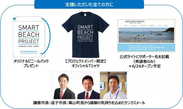 オリジナルビニールバッグ、【プロジェクトメンバー限定】オフィシャルTシャツ、公式サイトにサポーター名を記載(希望者のみ)、鎌倉市長・逗子市長・葉山町長から感謝の気持ちを込めたサンクスメール
