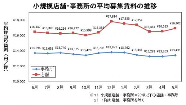 小規模店舗(20坪以下)の平均募集賃料は、前月から2.3%上昇しました。