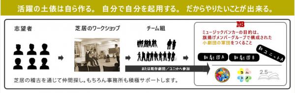 役者たちが自ら立ち上げ、責任を持って運営主体を担う新たな劇団やユニット設立を目指します。 前提として、「お客さん視点」を重視してコンセプトとミッションを定め、公演として成り立つものでありたい。共通ミッションは「舞台を、楽しみの選択肢に加える日常づくり」。 将来的には、この環境から小劇団やユニットが複数立ち上がり、独立公演を行っていきます。ミュージックバンカーの目的は、形になった団体、及び劇団員をマネジメントし、その先の芸能ビジネスに繋げていくことです。