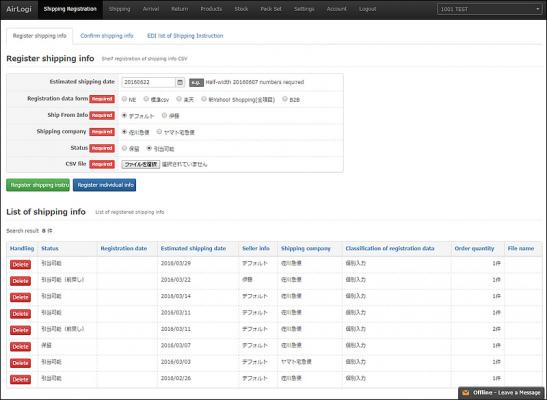 同社が開発販売を手掛けるクラウドWMSシステム「AiR Logi」は、2016年4月の正式リリース以降、すでに月間50,000件以上発送する大手アパレル通販や月間20,000件以上発送の大手化粧品通販、通販物流系の大手発送代行会社を中心に15社以上の導入がなされています。また、欧米、アセアンのグローバル企業、世界的ブランドも10社以上の導入実績となっています。主に欧米、アセアン企業では、日本へのB2C越境輸出の物流プラットフォームとしてクラウドWMSシステム「AiR Logi」の利用が進んでおります。