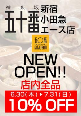 「神楽坂五十番 新宿小田急エース店」におきましては、新店オープン記念イベントといたしまして、2016年6月30日(木)~7月31日(日)限定で、店内全商品10%OFFセールにて販売いたしますので、是非ともお買い上げ下さいますようお願い申し上げます。