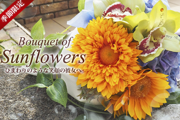 真夏の太陽に向かってまっすぐに咲く「ひまわり」は、男女を問わず人気の高いお花です。「あなたを見つめる」「情熱」といった花言葉を持つことから、愛の告白にも相応しいお花といわれています。実際に、夏のプロポーズ場所としてひまわり畑を選ぶ男性が多いことを受け、お誕生日プレゼントからプロポーズまで幅広いシーンでご利用いただけるフラワーアレンジメントとして「花束風メッセージフラワー ひまわり」が誕生しました。