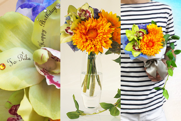 ひまわりの横で爽やかに咲く蘭(シンビジューム)には、メリアルームギフトの特徴である、フラワーメッセージをお入れすることができます。「Happy Birthday」や「Will you marry me?」といったメッセージや、プレゼントするお相手様のお名前や誕生石をお付けして、世界にひとつのオリジナル花束にカスタマイズが可能です。