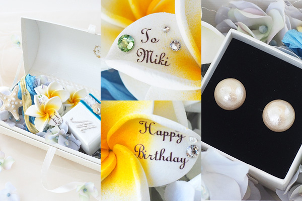 ボックスに敷き詰められたプルメリアの花には、「Happy Birthday」や「I Love You」などのメッセージをお入れすることができます。さらに、メッセージと一緒に、お相手様のお名前やイニシャル、誕生石を追加すると、女性が好きな「特別感」のあるギフトに変化します。