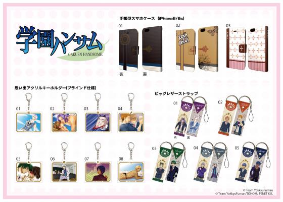 「学園ハンサム」各キャラクターの大事な部分をモチーフとした6種のアクリルキーホルダーがポロリと発売決定。ブラインド仕様で6種のうち1つはシークレット。老若男女皆様にご満足頂けるデザインでございます!思い出アクリルキーホルダー8種、ビッグレザーストラップ5種、手帳型iPhoneケース3種も同時発売。