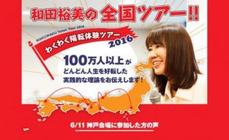 『わくわく陽転体験ツアー2016』の第一弾となる6/11(土)神戸会場は、満員御礼で開催。和田裕美のトークと参加者の熱気で盛り上がり、前向きな感想が数多く得られる結果に。回を重ねるごとに進化するこの陽転ツアー、今後も全国各地6箇所へ訪れます!!