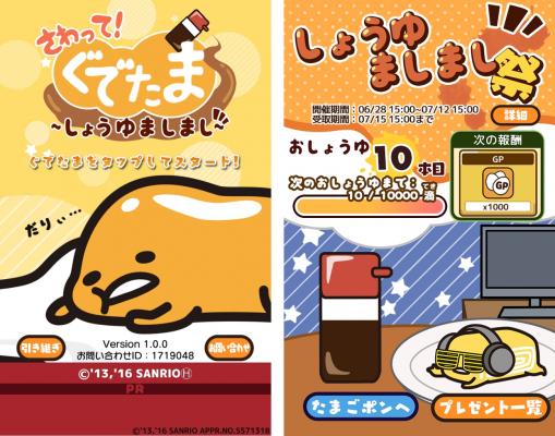 株式会社グッドラックスリー(本社:福岡県福岡市、代表取締役CEO:井上和久、以下「グッドラックスリー」)とギャザリング株式会社(本社:東京都千代田区、代表取締役社長:戸田和宏、以下「ギャザリング」)は、株式会社サンリオ(本社:東京都品川区、代表取締役社長:辻信太郎、以下「サンリオ」)よりライセンス許諾を受け、人気キャラクター「ぐでたま」が登場するゲームアプリ『さわって!ぐでたま ~しょうゆましまし~』(以下、本作)で、期間限定イベント「しょうゆましまし祭」を本日2016年6月28日(火)15:00より開催いたします。