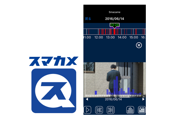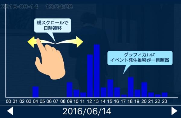今まで動体検知で自動録画された沢山のデータの中から、目当ての映像を探すのは非常に困難でした。今回発表する新機能『スマートプレイバック』は、イベント録画の発生頻度がひと目でわかるグラフィカルチャートや、映像を連続して確認できるスキップ・スキップ戻し機能など、映像をかんたんに検索するための様々な工夫が施されています。
