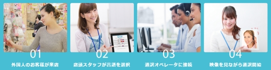 「みえる通訳」はタブレットやスマートフォンを使い、いつでもどこでもワンタッチで、通訳オペレーターにつながりお客様との接客をサポートする映像通訳サービスです。日本語と外国語が話せる専門の通訳スタッフと、Face To Face でお互いの顔や表情を見ることで微妙なニュアンスや機械では判別できない難しい内容でも会話することが出来ます。また、通訳コールセンターは英・中・韓・タイ・ロシアの5か国語に24時間365日対応しております。