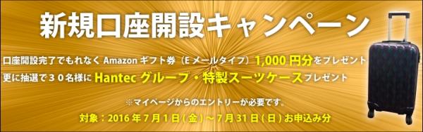 口座開設完了でAmazonギフト券(Eメールタイプ)1,000円分と抽選で30名様にHantecグループ・特製スーツケースをプレゼントします。