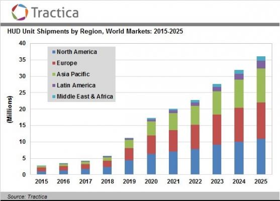 トラクティカ社(Tractica)の新しいレポートによると、2015-2025年の期間でヘッドアップディスプレイ (HUD)の世界の出荷数は1億8290万個に及ぶ見込みだ。また同社は29.6%の年平均成長率(CAGR)でヘッドアップディスプレイ (HUD)の出荷数が2015年の270万台から2025年には360万台に増加するとも予想している