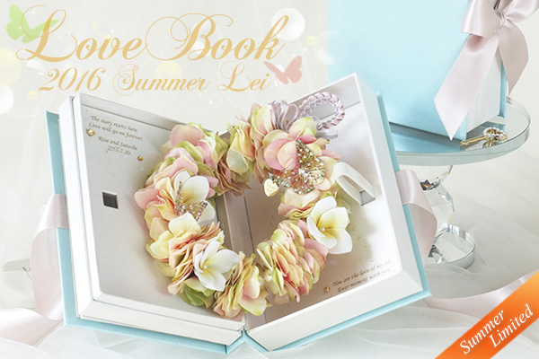 メリアルームの「Love Book」シリーズは、春・夏・冬と3シーズンでデザインを変更して販売している人気のプロポーズアイテムです。春の桜に続き、夏は南国で愛される「レイ」をモチーフにしたデザインで販売を開始致します。歓迎や敬愛の気持ちが表現されているレイは、ハワイやタヒチなど南国で長年親しまれてきた伝統的な装飾品。夏らしく、太陽をいっぱいにあびた花々が咲く様子を立体的に表現しております。