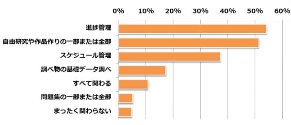 夏休みの宿題のどんな点について親が関わるか?という問いについては、「進捗管理」と「自由研究や作品作りの一部または全部」が約5割、次に「スケジュール管理」が約4割の回答でした。