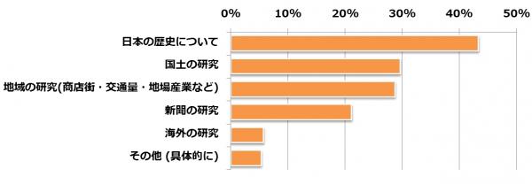 社会の自由研究で最も多く選ばれたテーマは、半数近くの方が選んだ「日本の歴史について」でした。次に「国土の研究」「地域の研究」が約3割と人気ですね。