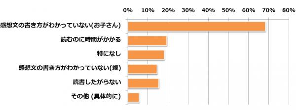 読書感想文を書くにあたり困りそうなことについては、「感想文の書き方がわかっていない」という方が約7割でした。また、「読むのに時間がかかる」という方が約2割いらっしゃいますが、その他の回答で「書くのに時間がかかる」というコメントもありました。