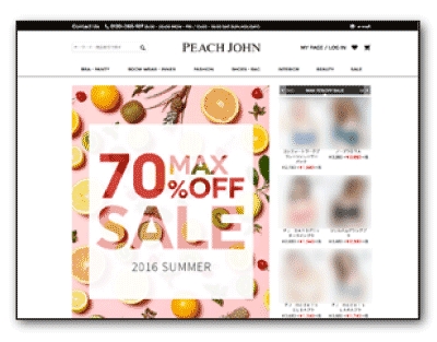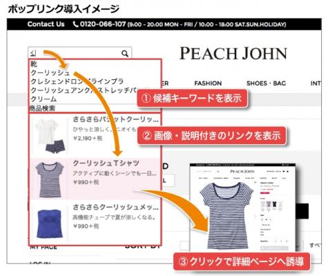 今回の「ポップリンク」導入では、PEACH JOHN公式ホームページ( http://www.peachjohn.co.jp )で取り扱うアイテムの検索時に、最小のテキスト入力で、予測される検索キーワードの表示と該当するアイテムと商品詳細ページへのリンクを検索窓上に表示します。