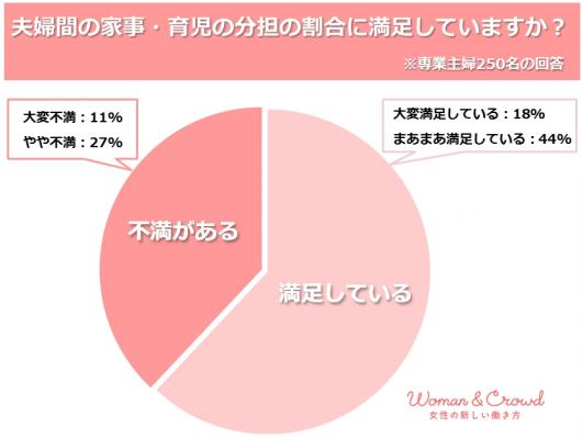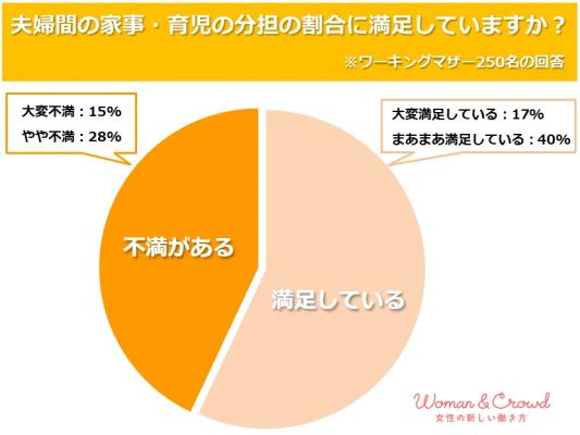 夫婦間の家事・育児の分担の割合に満足しているかという質問に対して、専業主婦では38%、ワーキングマザーでは43%の女性が不満を抱えていることがわかりました。