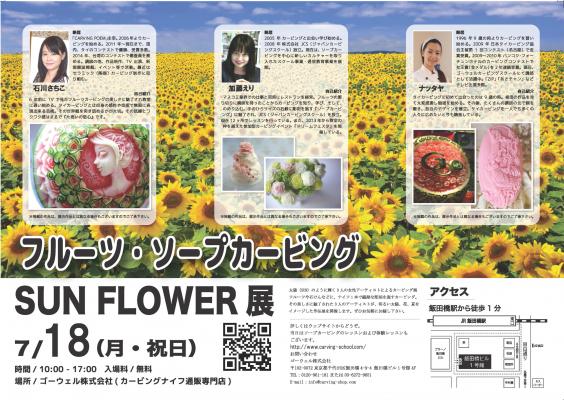 フルーツ・ソープカービングスクールを運営するゴーウェル株式会社(東京都千代田区 代表取締役松田秀和)は2016年7月18日(月・祝日)にカービングの展示会SUN FLOWER展を開催します。同展示会は昨年も250名以上の来場者で賑わいました。カービングを既にされている方も、作品に興味がある方もどなたでもお気軽にお越しください。