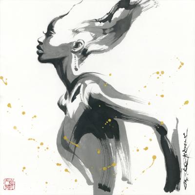 和紙の上へ墨汁を走らせるように描く、茂本ヒデキチ氏。毛筆の特長を十二分に活かしながら、墨色の濃淡を織りまぜて美しく、時に紙へ殴りかかるように激しく、また墨の滴下も点描画のような味わいとして援用し、大胆かつ繊細に仕上げられるユニークな画法で知られています。アスリートやダンサー、侍、カーレースなど、しばしばモチーフの「動き」が絵の主題に。それらの輪郭は明瞭でなく、流れるようなその筆致に溶け落ちていますが、茂本氏の眼で捉えられた人のパッション、モノのエネルギーは、彼の体躯と腕のストロークに乗り移り、紙にアウトプットされて見るものの五感へ強烈な印象を残します。