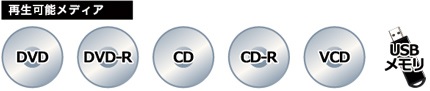 動画:DVD-VIDEO /MPEG1/MPEG2 /SVCD/DIVX 音楽:CD-AUDIO/ HDCD /MP3/WMA 画像:JPEG