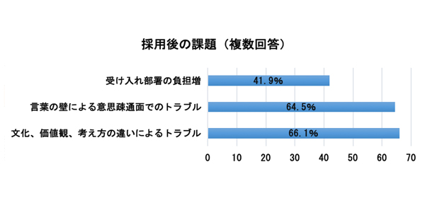 外国人採用を検討している企業様の不安要素として、46%の企業様が「社内受け入れ体制が未整備」と回答しており、具体的には外国人とのコミュニケーション方法、キャリアパスなどの制度設計です。また採用後はコミュニケーション不足(66.1%)によるトラブルが目立ちます。