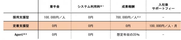 定着支援型プラン:採用から入社までの費用は一切かかりません。入社後のサポートフィーとして一名あたり100,000円/月を頂きます。