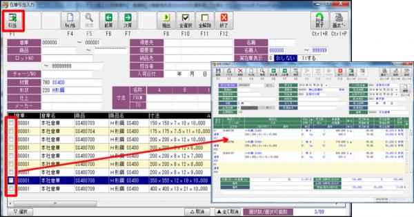 ※ 在庫照会時に選択した商品情報を、受発注・加工指示などの各種入力画面に引当可能。