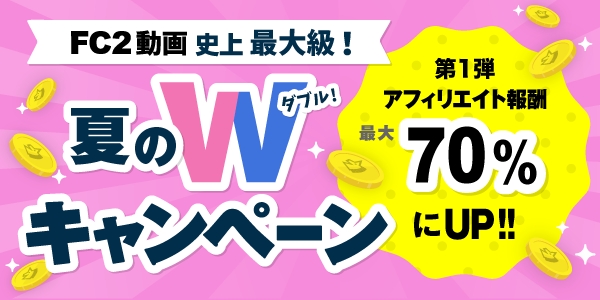 このキャンペーンは「FC2夏のWキャンペーン」の第1弾として実施しており、キャンペーン期間中は動画アフィリエイト報酬を最大70%まで大幅にアップしています。