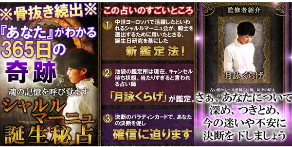 本鑑定ではシャルルマーニュ公がパラディン(聖騎士)を選出するために用いていた誕生日からの魂の探求法、誕生日における西洋占星術、数秘術の研究をもとにした自然魔術の原理から月詠くらげが体系づけた古代誕生秘占「シャルルマーニュ誕生秘占」を用いて鑑定をしていきます。古代ルネサンス朝では誕生日を知られることほど恐ろしい事はないと呼ばれ、誕生日を知られることはご法度となっていました。本鑑定ではシャルルマーニュ誕生秘占をもとにあなたの現実に迫り、あなたの魂の存在と、求むるるところを明らかにしていきます。